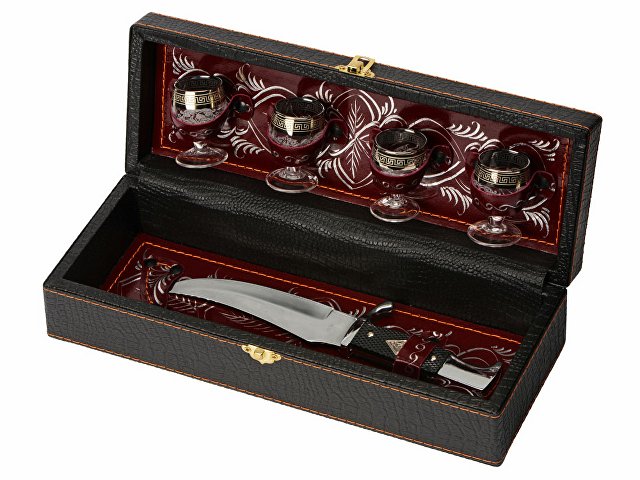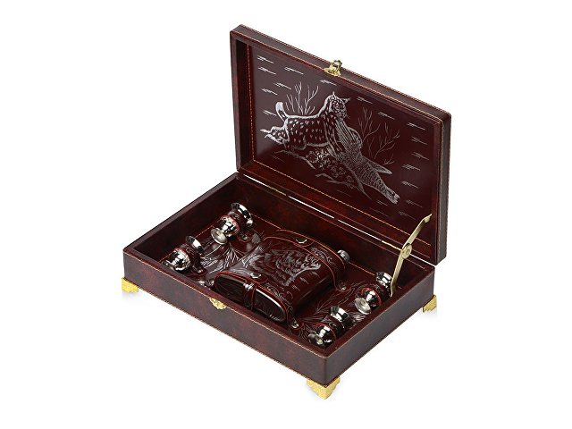 Кейс из сплит-кожи, с повышенной износостойкостью, внутренняя отделка натуральная кожа с художественным выжиганием. В комплекте: Стопка 40мл (нейзильбер)- 4 шт. Фляга 500мл- 1шт